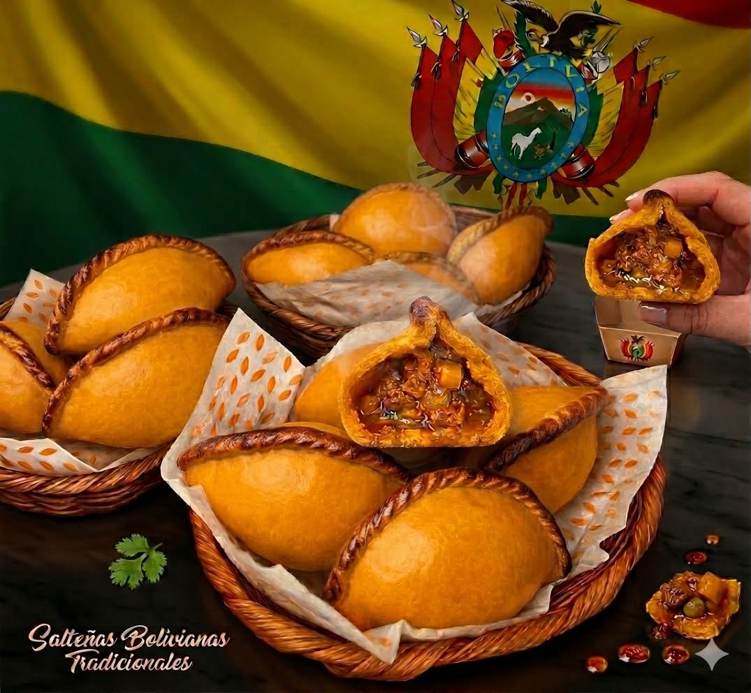 Salteñas recheadas com frango suculento, batata cozida, caldo tradicional, ovo, azeitona e temperos tradicionais, perfeitas para um lanche rápido e cheio de sabor boliviano.